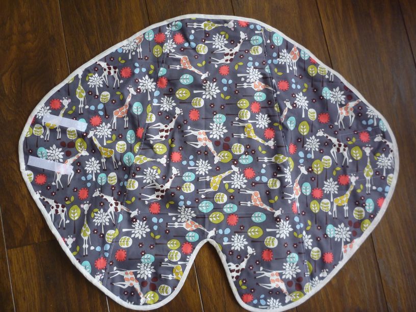 Voor Sarah maakte ik (alweer een tijdje terug) net zo'n wikkeldoek als voor ons kindje. Sarah is helemaal gek van giraffen, en dus zijn we samen op zoek gegaan naar een leuke stof met giraffen erop. Omdat het een jongetje wordt, heb ik de doek gevoerd met lichtblauw flanel. Hij is erg leuk geworden!